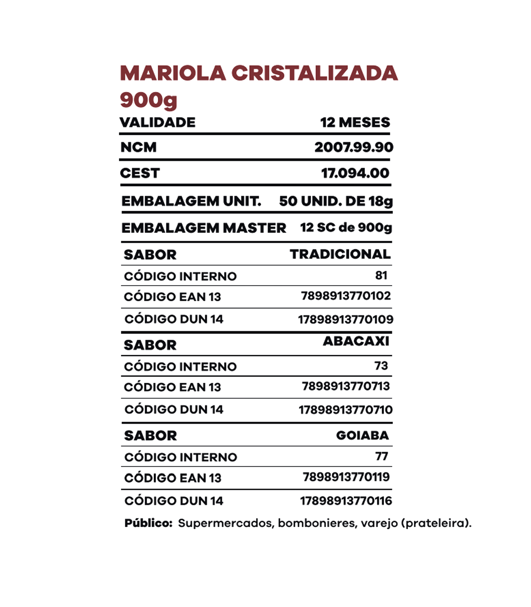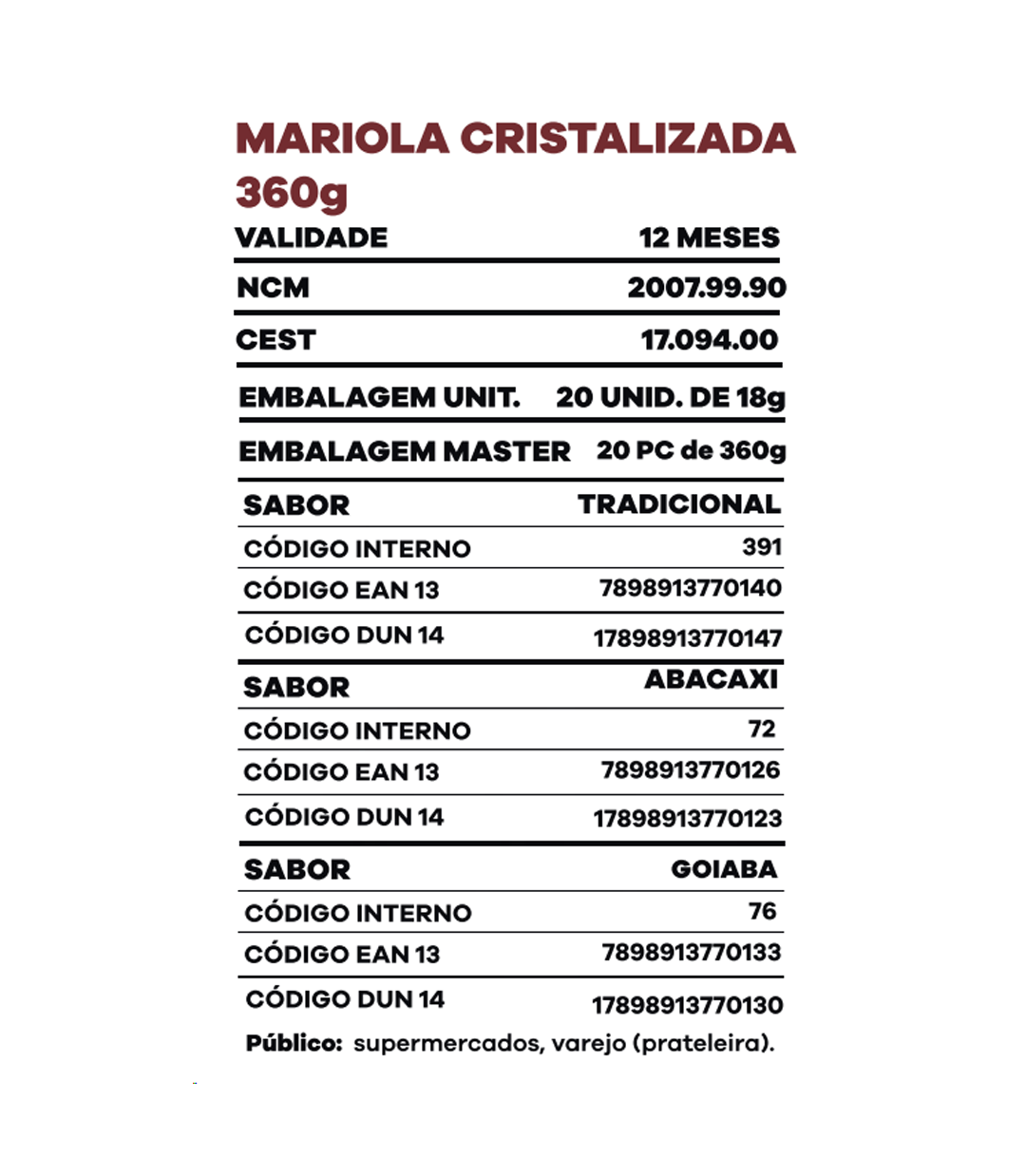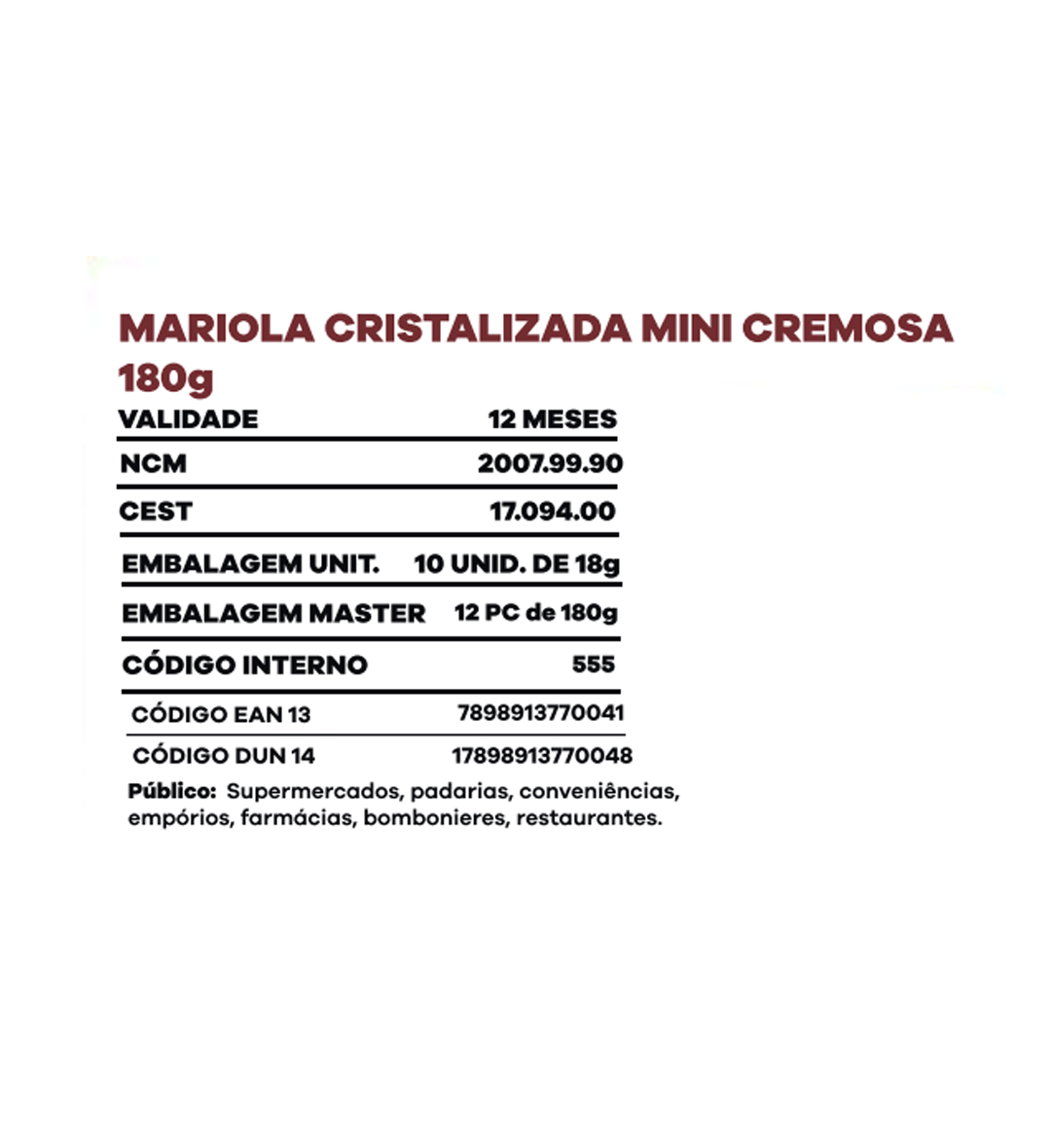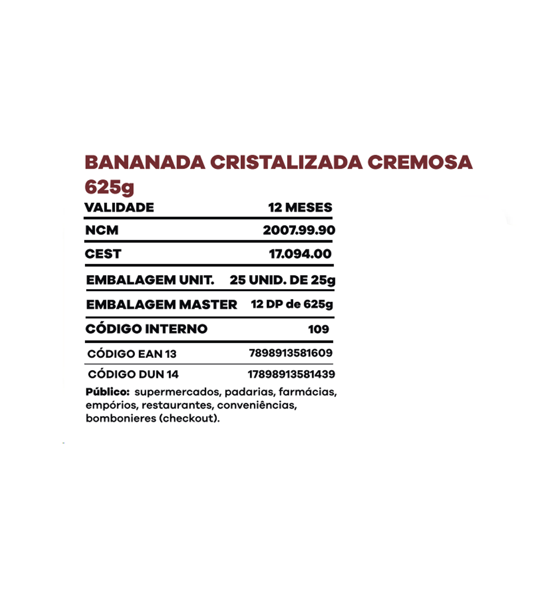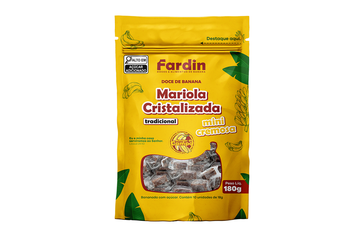 Traga o sabor autêntico da infância para seus clientes com a nossa Mariola Cristalizada Fardin! Popular e com aquele toque caseiro que evoca pertencimento, este produto é mais do que um doce: é uma experiência acessível e memorável. Este Clássico é um abridor de mercado estratégico. Com um diferencial inquestionável, ele é feito com BANANA DE VERDADE, sem nenhum tipo de corante ou aromatizante. Essa pureza, combinada à nossa embalagem atraente e de alta qualidade, não só atrai um público fiel que valoriza a autenticidade, mas também posiciona seu negócio com um produto superior. Invista em um clássico que inova na qualidade e expande suas oportunidades de venda!