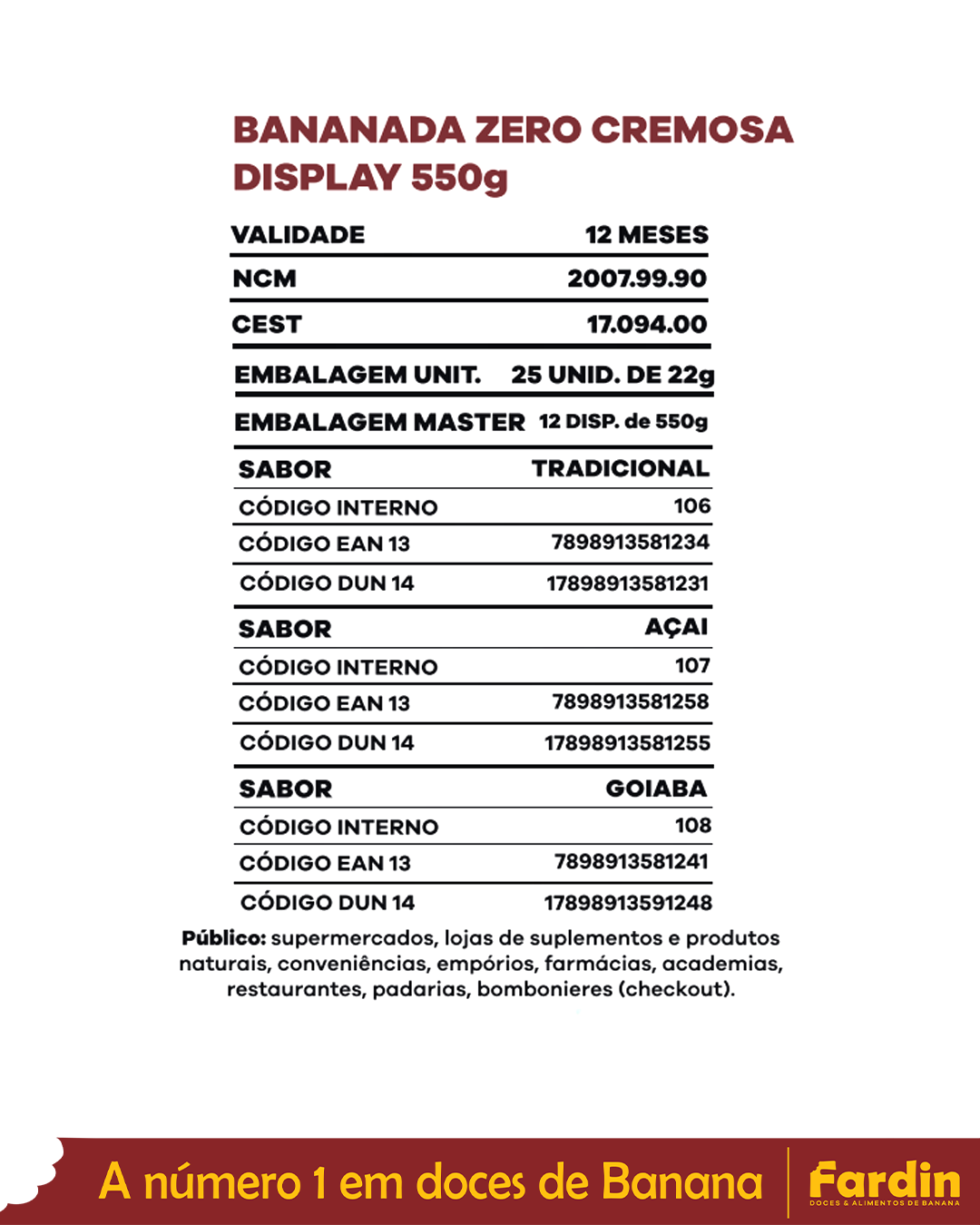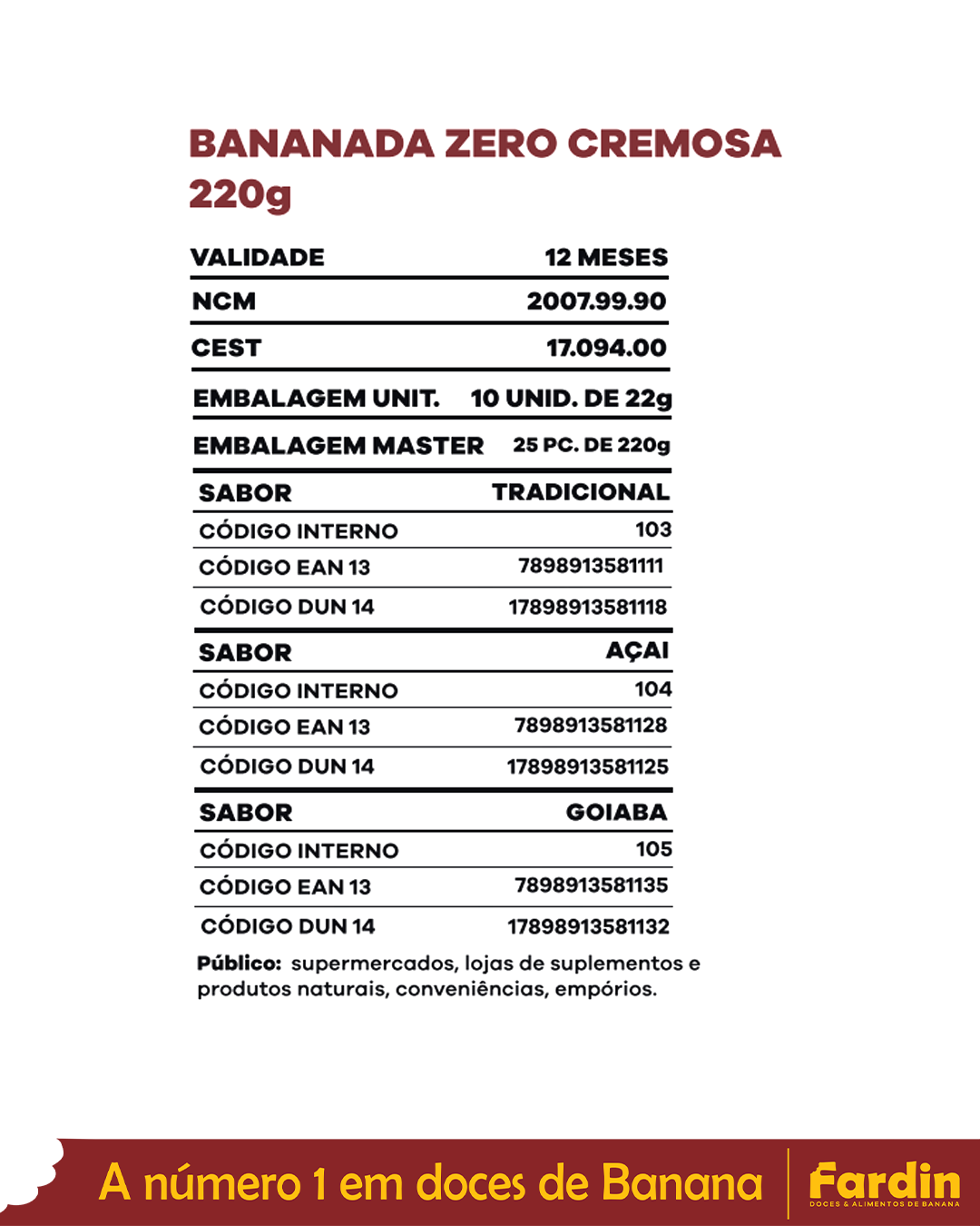 A linha Zero Açúcar Fardin é a escolha inteligente para seu negócio. Experimentando um crescimento exponencial que dobrou suas vendas, esta é a oportunidade de ouro para atender um mercado em expansão. Nossos produtos não contêm adição de açúcares, preservam o sabor autêntico da fruta e são ideais para consumidores com restrições alimentares. Invista em uma linha de sucesso comprovado e veja seu lucro crescer!